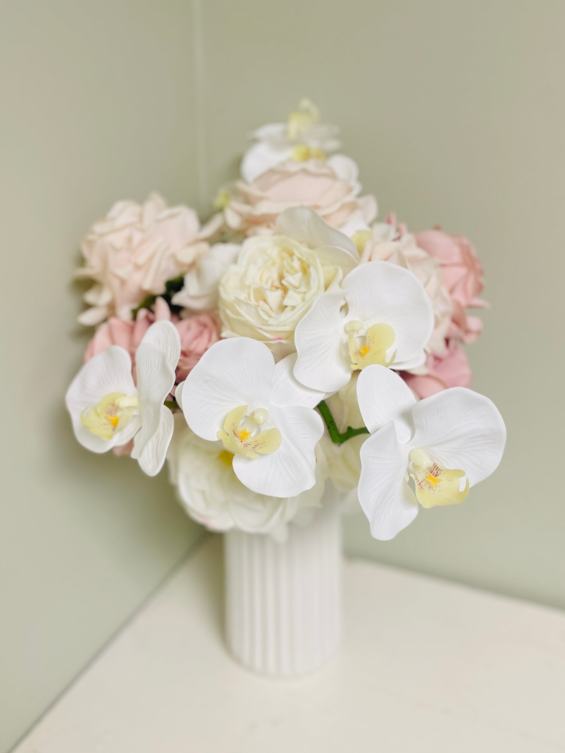 The Angelica large centrepiece is made of many rose varieties including open garden roses, David Austin roses and Austin roses in a creamy palette of white, dusk rose pink and ivory. The centrepiece is highlighted with delicate orchids in white cascading from the vase. The centrepiece is designed in the modern white ceramic vase as pictured. The vase cannot be removed. Premium real-touch florals.
