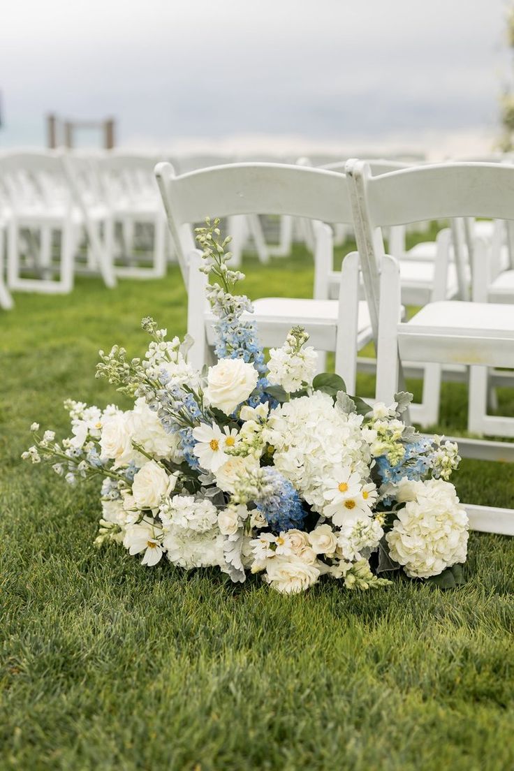 Create a stunning focal point with the 'Chelsea' Floral Meadow, an artfully arranged, vase-less arrangement with a big impact. The Chelsea floral meadow is designed to perfectly coordinate with our 'Chelsea' Collection. This floral meadow features a soft and romantic mix of real-touch ivory roses, romantic real-touch delphinium, luxe blue real-touch hydrangea, and a kiss of real-touch eucalyptus. Its eye-catching design is ideal for ceremony backdrops, aisle decor, band stands and sweetheart tables.